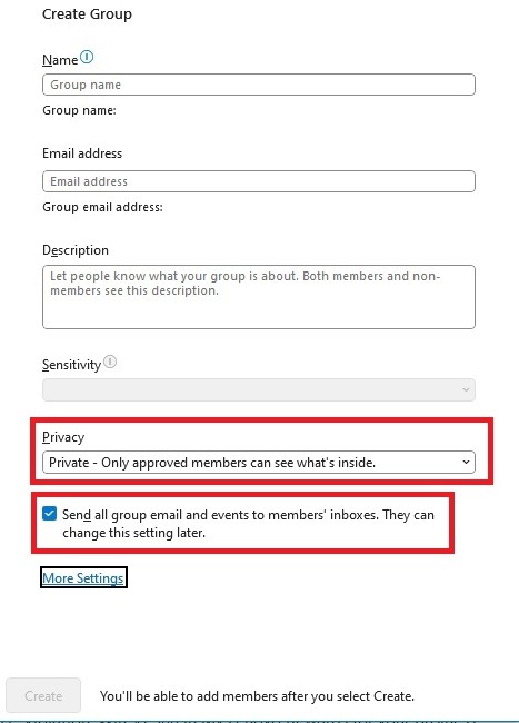 - You can select to "Send all group conversations and events to members' inboxes." This allows members to see all group conversations and events in their inbox without having to visit the Group directly.
