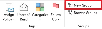 From the Home tab in Outlook, select New Group from the Groups section of the Ribbon.