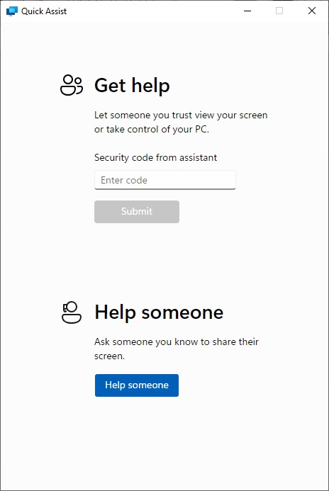 Once Quick Assist opens, you will see a screen where you can request or offer assistance: