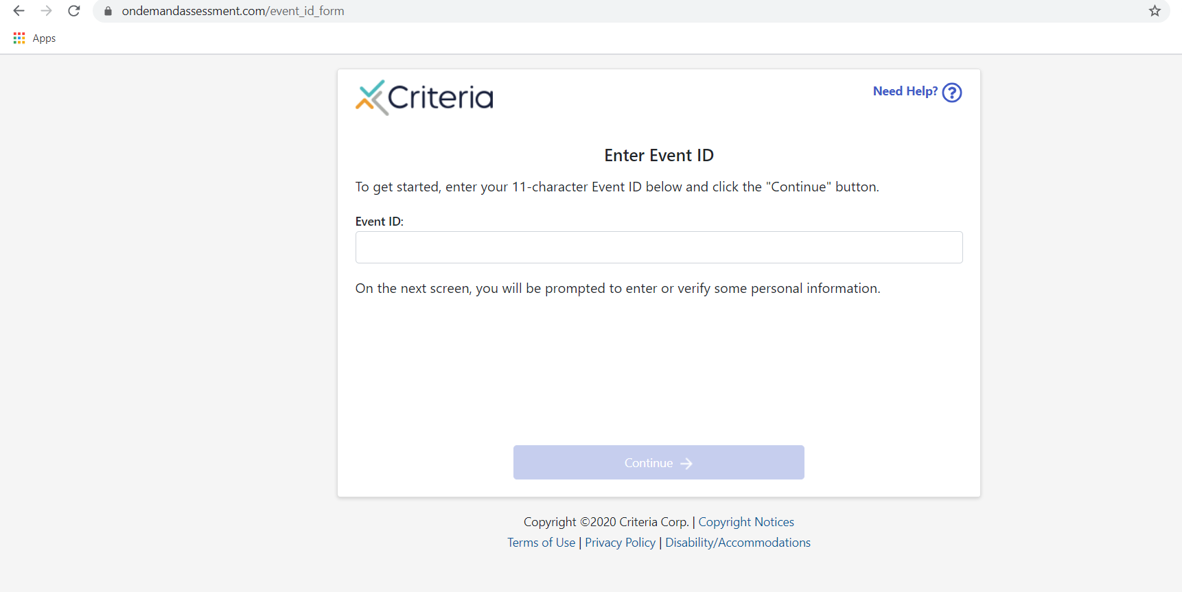 2) Click "Continue" and then Enter the "Event ID" (Note: This Event ID is created prior to taking any test, and it is a number that is assigned to each test taker.)